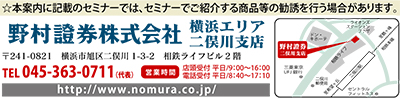 「私たちは今後も、お客様の満足度向上に取り組んでまいります。これからも、野村證券二俣川支店をどうぞよろしくお願い申し上げます」と語った。セミナーは予約制。詳細問い合わせ、参加申し込みは電話、またはホームページで受け付けている。