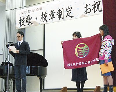 市立四季の森小学校(深山(みやま)喜美子校長・335人)=上白根=の校歌・校章が完成し、11月23日「お祝いの会」で披露された。校章は校内でデザインを募集し、保護者の小川淳さんの作品を選定。校歌には児童から要望のあったフレーズが盛り込まれた。