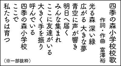 児童減少による再編統合で、昨年新設された四季の森小。開校から2年目の今年、待望の校章と校歌が完成した。同校の校歌・校章制作委員会の中野保弘会長(71)は「開校には間に合わなかったが、時間をかけた分、良いものができた」と完成を喜んだ。