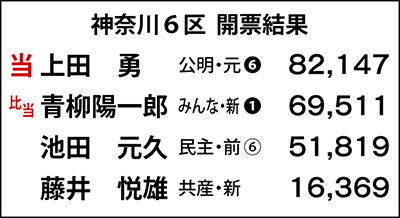 衆議院議員選挙の投開票が12月16日に行われた。自民党が単独過半数を獲得する大勝の中、前・元職と新人が争った神奈川6区(保土ケ谷・旭区)では、公明党の元職・上田勇氏(54)が民主党の前職・池田元久氏(72)を下し、6度目の当選を決めた。みんなの党の新人・青柳陽一郎氏(43)は比例代表で復活当選。共産党新人・藤井悦雄氏(60)は議席を獲得できなかった。