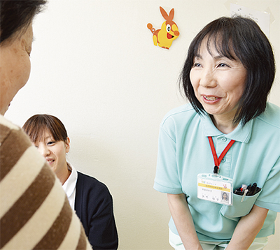 同院では20代〜60代の看護助手70人が在籍するが、その多くが医療や介護に関して未経験者だという。2年前から働いている矢竹秋子さんもその一人。前は電気機器を扱う会社に勤務しており、医療現場に関わるのは初めてだった。「はじめは『難しそう』と思っていましたが、実際の業務内容は家事の延長業務がほとんど。周りの先輩も丁寧に教えてくれるので、不安はすぐに解消されました」と矢竹さん。