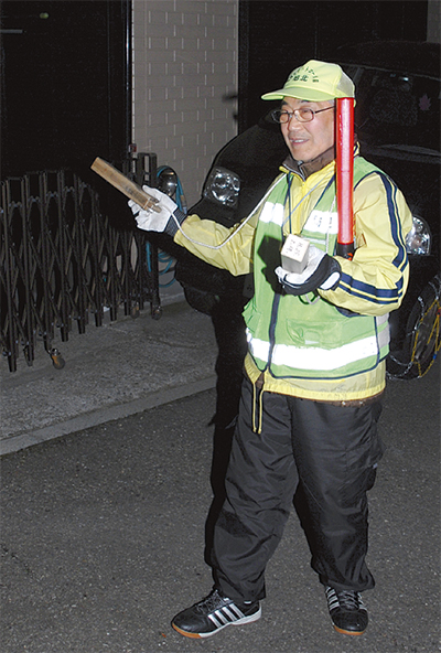 寒い冬でも「今日も無事だったと思えればいい。運動不足の解消にもなるし、趣味みたいなもの」と笑う。拍子木の音がすると、地元に住む人は「9時だ」と思うほど。「いつも回ってくれているというだけで、すごく安心する。あのカンカンという音は、どこか懐かしい」。近所に住む武田武さん(46)は、そう話す。