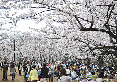 区内各所で桜が見ごろを迎え、こども自然公園=大池町=でも3月23日、多くの花見客で賑わった=写真。家族連れやカップルが足を運び、約1千本の桜の下で食事などを楽しんだ。