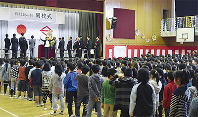 開校式では体育館いっぱいに児童が整列。小規模校対策検討委員会の林重克委員長は「3校の歴史を引き継ぐとともに、地域の小学校として新たな歴史をつくってほしい」とあいさつ。最後は横浜市歌を斉唱し、新たなスタートを切った。