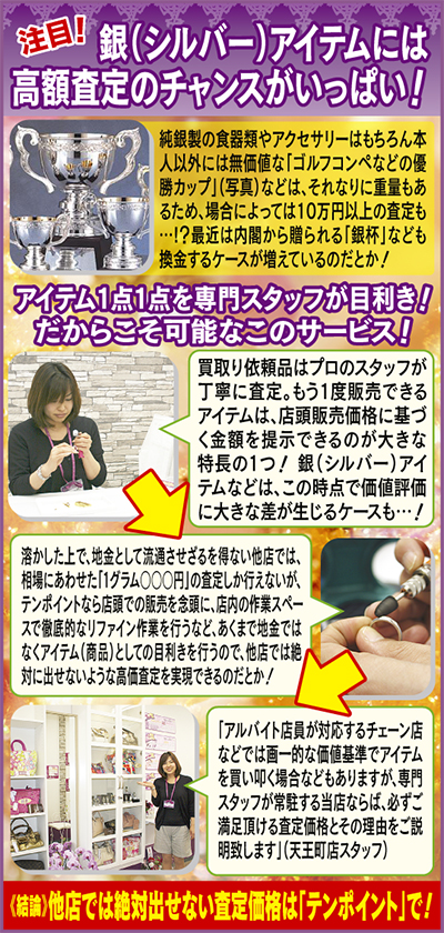 そんな中、他店を圧倒する独自の査定基準を採用し、多くのリピーターから高い支持を集める地元の買取専門店『テンポイント』では「大型チェーン店などでは査定すら断られた銀製品を当店にお持ち頂き、思わぬボーナスを手にする方が、最近特に増えてきていますよ!」と説明する。