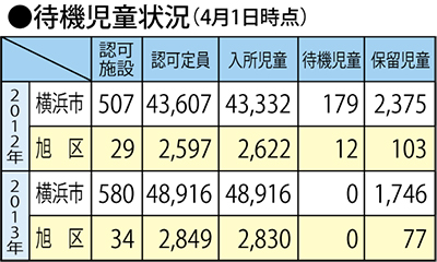 横浜市は5月、保育所待機児童数が前年比で179人減りゼロになったと発表。認可保育所が4月まで1年で5カ所新設の34カ所に増えた旭区でも、昨年から12人減少した。成果が見られる一方、希望する保育所に入所できない保留児童(※)が市で1746人、旭区では77人(4月1日時点)いることなど課題も残る。