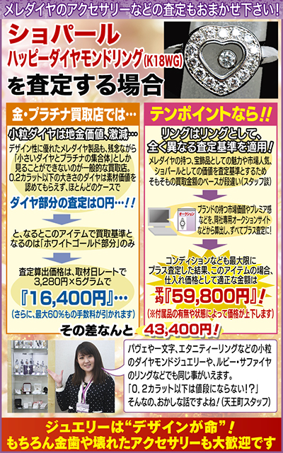 左欄のアイテムの場合、同店では地金の高評価に加え他店では一切評価できない場合が大半の「ダイヤモンド部分」にまでプラス査定を付けた上で、人気ブランド「ショパール」の中でもハートのデザインが可愛らしいその芸術性や希少価値を踏まえ買取価格を決定するので、その差は歴然!ぜひ無料見積でお確かめを。