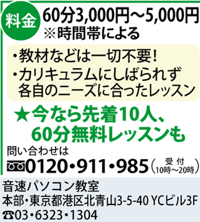 DVD教材を使ったパソコン教室としてこれまで8千人の指導実績を誇る「音速パソコン教室」。このたび横浜市内で、講師が自宅に来て教えてくれる出張レッスンを開始する。講師は同教室出身の金子さん。