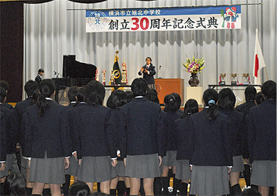 市立旭北中学校(青木康茂校長)の創立30周年記念式典・祝賀会が11月9日、同校体育館で行われた。