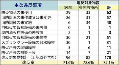 福岡市で発生した診療所火災を受け、横浜市消防局が市内の病院・有床診療所に対する特別査察を行った。結果、247施設の内7割を超える178施設で消防法令の違反を確認した。同局は「対象施設へ改善計画の提出を求め早急な是正を促す」と話している。