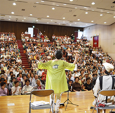 当日は開場前から列ができ、会場はほぼ満席。指揮者に合わせて、約470人が「赤とんぼ」や「おぼろ月夜」「幸せなら手をたたこう」「山のロザリア」など約30曲を、声を揃えて歌っていた=写真。木村委員長は「普段よりも皆さんイキイキと歌っていた。地域ケアプラザでの会にも参加して、元気に歌ってもらいたい」と話していた。