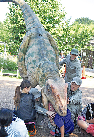 これは「驚きの体感!恐竜ライブ」と題し行われたイベントの一環。会場となった園内のころころ広場に現れたのは、本物さながらに作られた、全長4・5mの「ラプトル」と全長6mの「アロサウルス」の2頭。叫び声とともに恐竜が登場すると、会場からは大きな歓声があがっていた。