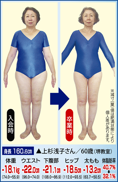 体調を崩したことで体重が増えてしまい、膝の痛みに悩んでいた上杉さん。そんな時にプロポーション・アカデミーのチラシを見つけ、「私にもできそう。年齢的に今しかない!」とすぐ行動に。20種類の多彩なスリムマシンを見たときは「本当に効くの?」と思ったが、使ってみると心地良くてビックリ!身体を刺激することでガチガチの脂肪が柔らかくなったという。通う度に身体が軽くなり、ウエスト22cm減、お腹21・1cm減の大幅なサイズダウンに繋がった。さらに体重18・1kg減で膝痛も解消、「美しいスタイルと健康な身体になれて最高」と大満足。