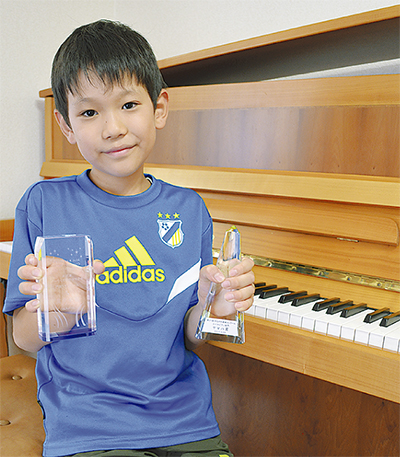 ユースピアノ部門には幼児・小・中・高校生800人が参加し、本選では43人が課題曲を演奏した。佐藤君は今回のような大規模なコンクールは初出場ながら、W受賞を達成。「上手な人がたくさんいたから驚いた。でも賞がとれてうれしい。受賞式はすごく緊張した」と笑顔を見せた。