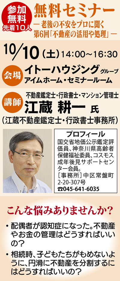 二俣川駅北口のアイムホームでは10月10日(土)、無料相続セミナーを開催。講師は、不動産鑑定士・行政書士・マンション管理士の江蔵(えぞう)耕一氏。不動産のほか成年後見の業務や各種セミナーの講師を多く務める。