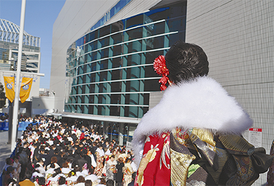 国内最大級の規模を誇る横浜市の成人式。式典は午前と午後の2回に分けて行われ、第1回は午前9時40分開場・10時半開始。第2回は午後1時40分開場・2時半開始。旭区は第1回への参加となる。