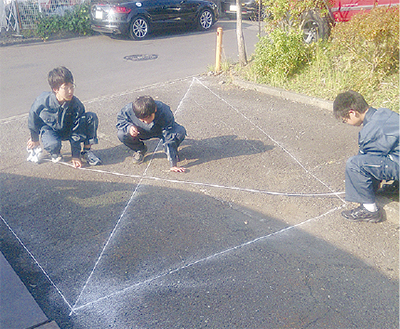 舗装工事では面積を測るのに三角形を連続して描くことで測定する。生徒らも実際にチョークで線を引き実践。またショベルカーの試乗体験も行い、生徒らは楽しそうな表情を見せていた。同社の頭山俊男さんは「建設業の魅力を知ってもらい、将来の職業選択の一つに入れてもらえれば。今後も職業体験の受け入れをしていきたい」と話した。