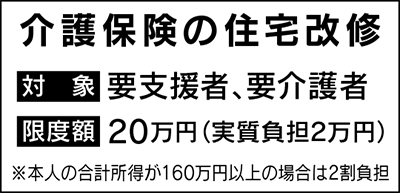 イトーハウジンググループの「イトーハウジング」と「アイムホーム」では3月から介護保険が利用できる住宅リフォーム事業を始めた。同社の福祉用具専門スタッフが応じる。手すりのほか、段差の解消や滑りにくい床材への変更、洋式便器への交換なども対象だ。