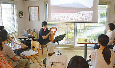 今回は二俣川在住のライアー奏者・井上ゆり子さんの企画によるフォトコンサートを開催。参加者の思い出の写真を上映しながら、ライアーの音色を響かせた。