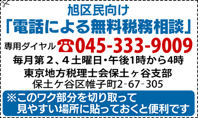 旭区をはじめ保土ケ谷区と瀬谷区の税理士団体「東京地方税理士会 保土ヶ谷支部」が電話による「無料税務相談」の利用を広く呼び掛けている。