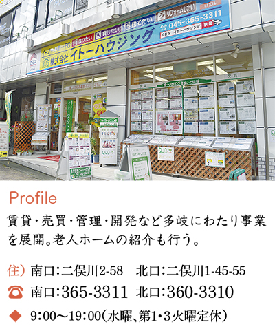 二俣川駅南口と北口に店舗を構える「イトーハウジング」(松島信之代表取締役)は、賃貸・売買をはじめ、不動産の管理・開発、リフォームなどを行う地域に根ざした総合的な不動産会社。スタッフも地元に精通しており、理想の住まい探しの力になってくれる。松島護店長は「お客様の一生の住まいを提案できる会社でありたい。ライフスタイルを考えて、総合的に提案するようにしています」と話す。