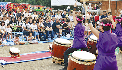 例大祭は神社における最も盛大な祭事の一つ。午前11時から大祭式典が行われ、午後4時からは奉納演芸大会を実施。個人や団体が観衆の前で和太鼓や歌、ダンスなどさまざまなパフォーマンスを披露し、会場を大いに盛り上げた=写真。