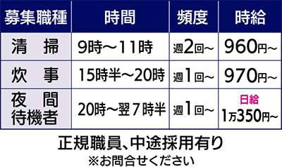 横浜市内で障害児・者などを対象とした福祉サービスを展開する社会福祉法人「同愛会」が、清掃や炊事従事者、夜間待機者をそれぞれ若干名募集している=表参照。