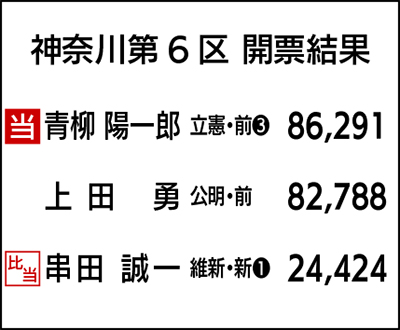 衆議院議員選挙が10月22日に投開票され、神奈川6区(旭区・保土ケ谷区)は、立憲民主党の前職・青柳陽一郎氏(48)が8万6291票を獲得し、公明党の前職で8度目の当選を目指した上田勇氏(59)と3度目の対決で初めて選挙区を制し、3度目の当選を果たした。また、日本維新の会の新人・串田誠一氏(59)が比例区で復活当選した。
