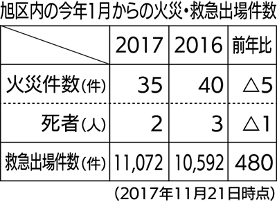 今年1月からの旭区内の火災件数は35件(前年比5件減)、救急出場件数は1万1072件(同480件増)だった(11月21日時点)。12月からはストーブによる火災も多発する傾向にあるため、旭消防署では注意を呼び掛けている。