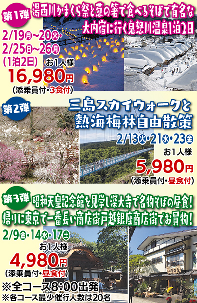 第1弾は益子焼の小峰窯で絵付け体験をして、日光ろばた漬け鬼怒川店で浅漬け体験と買物を楽しむ。夜は湯西川かまくら祭でロマンチックなろうそくの明かりが灯る「ミニかまくら」を堪能し、鬼怒川温泉で疲れを癒して。ホテルサンシャイン鬼怒川に宿泊し、葱の箸で食べるそばで有名な寄棟造りの建物が並ぶ大内宿を散策。