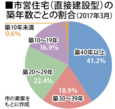 市建築局市営住宅課によると、市内には約3万1千戸の市営住宅があり、市が直接建設・保有するのは約2万7300戸。その約41%が築40年以上になっており、35〜45年頃に法定耐用年限(70年)に達することから、工事や入居者の仮移転のピークを分散させる必要があるという。