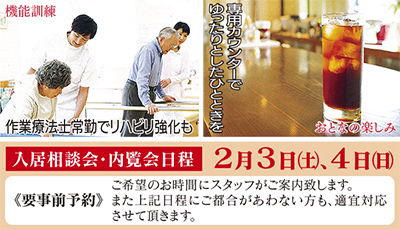 手厚い介護や看護のため「入居者2人に対して職員1人以上」という法定基準を上回る人員体制で安心のシニアライフをサポートするほか、常勤の作業療法士による親身なリハビリ等でいきいき健康ライフのバックアップも。また昼は本格コーヒー、夜はお酒を嗜める専用カウンターや、夫婦揃って入居可能な居室を4部屋用意しているのも魅力の一つ。