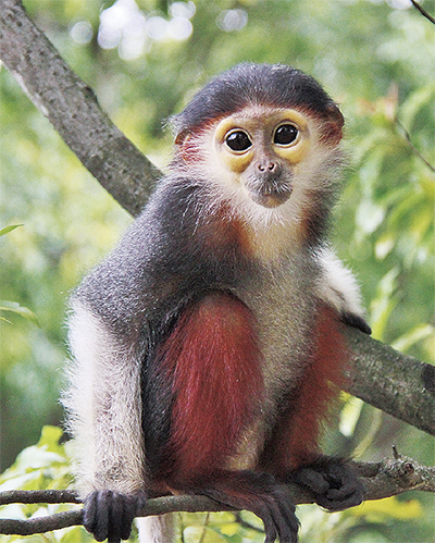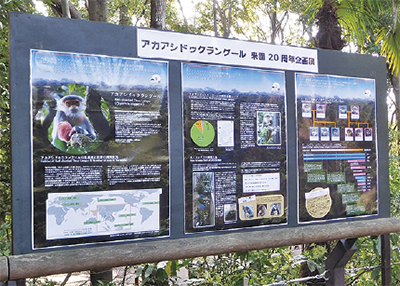 アカアシドゥクラングールは「世界一美しいサル」とも言われる絶滅危惧種の動物。同園には1998年に雄2頭が来園。2012年、13年には繁殖を目的に雌1頭ずつがシンガポールから来園し、13年に繁殖に成功した。現在は10頭となり、国内では同園のみで飼育されている。
