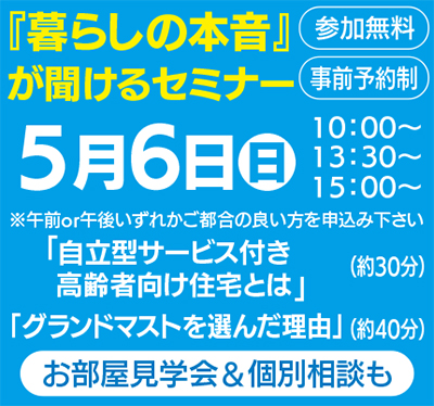 「今は元気だけどこれからの生活を考えると不安」「サ高住の違いが判らなくて決められない」など、住まい選びで悩んでいる方は多いはず。高齢者住宅について、「知りたい実際のこと」を現場担当者が教えてくれるセミナーが5月6日(日)、「グランドマストみなまきみらい」で開催される。