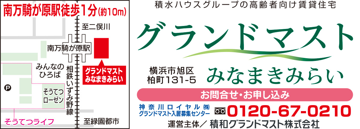 昨年オープンした「グランドマストみなまきみらい」は、相鉄いずみ野線「南万騎が原」駅の改札を出て目の前の好立地。スーパーや病院も近くにあり、周辺には公園や緑が多いため、伸び伸びと暮らしを満喫できる。