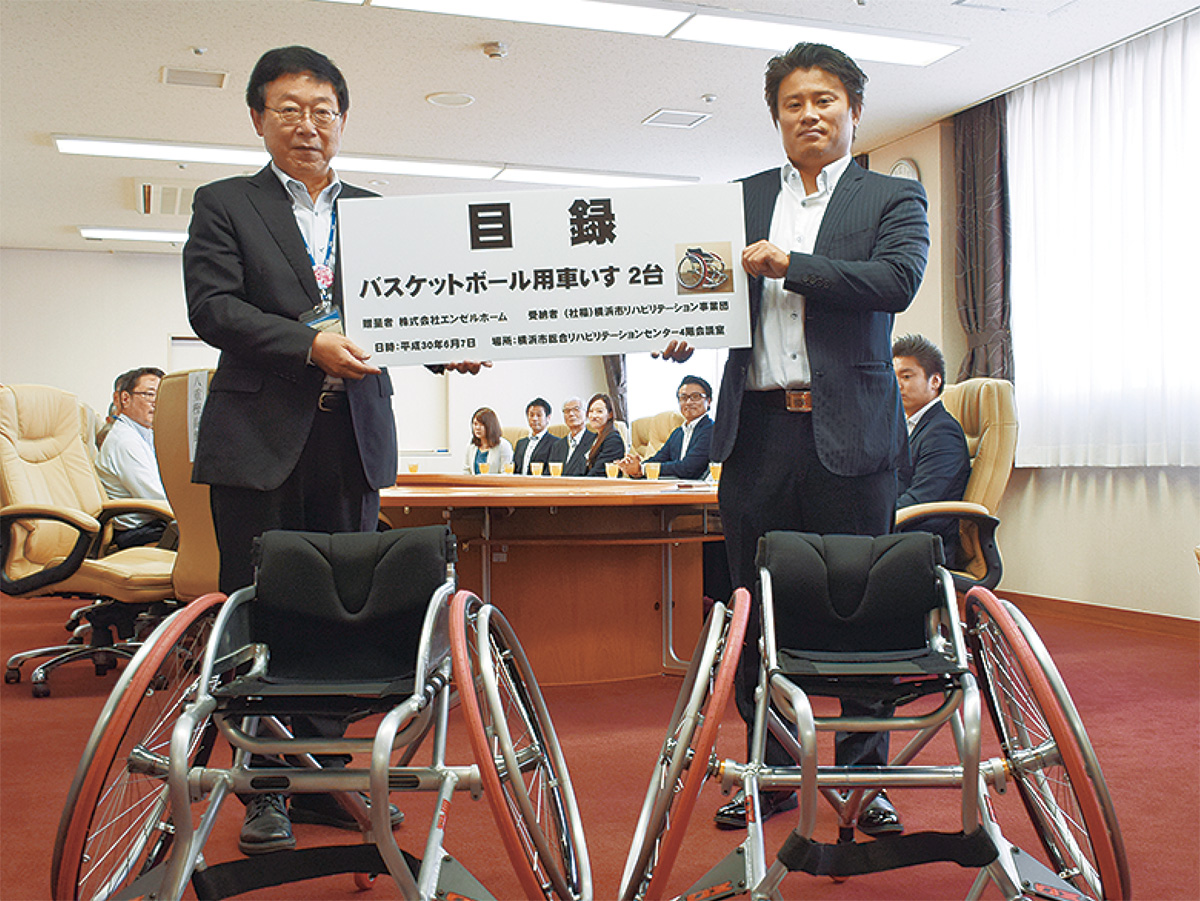 車いすを寄贈したのは、二俣川に本社を構える(株)エンゼルホーム(橋本良樹代表取締役兼CEO)。橋本代表は数年前から、自身の息子が同施設でミニバスケットボールの練習をしていることから、隣のコートで車いすバスケの練習をする障害者を見てきた。また、地元九州で行われている国際車いすマラソンを幼少期に見て感動した覚えがあることなどが寄贈への思いにつながったという。
