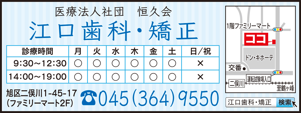 院長が旭区歯科医師会の会長を務め、地域の歯科医療を支えている二俣川の「江口歯科・矯正」。江口康久万院長は東京医科歯科大学顎顔面矯正学同門会で副会長を務めたこともあり、多くの矯正医を育ててきた。