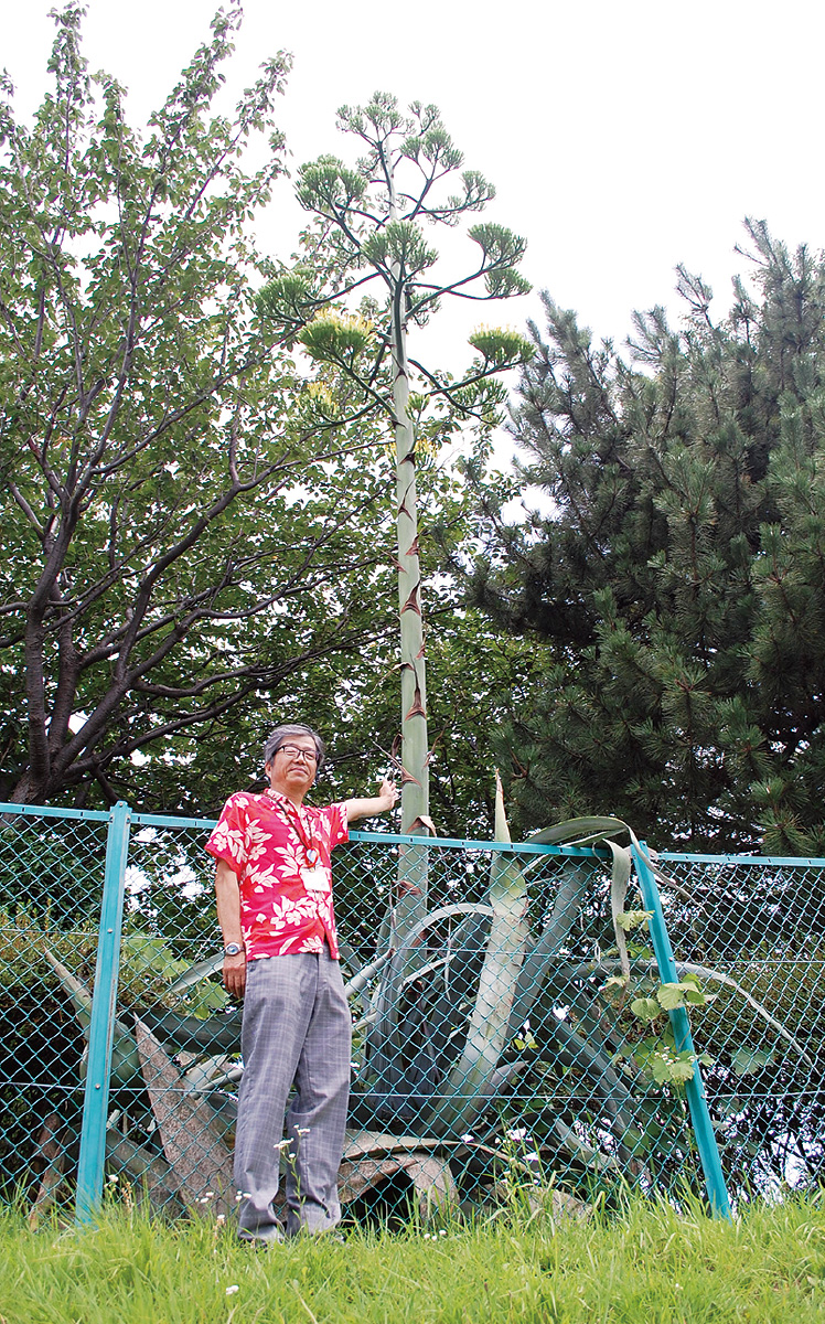 「5月の連休明けぐらいにニョキニョキ伸び始めていることに職員が気が付いたんですよ」と話す小嶋所長。それまでは、枯れたような状態で、何の植物かもわからなかったという。「すぐにインターネットで調べました。それまではアロエのお化けみたいな植物だと思っていました」。古いことなので、いつ植えられたのかは定かではないというが「おそらく、1973年の開館時に植えられたのではないかと思います。ちょうど45周年の機会に咲き始めたのはうれしいですね。施設の外周部に植わっているので、外からも気軽に見に来ていただけます」と小嶋所長は話す。
