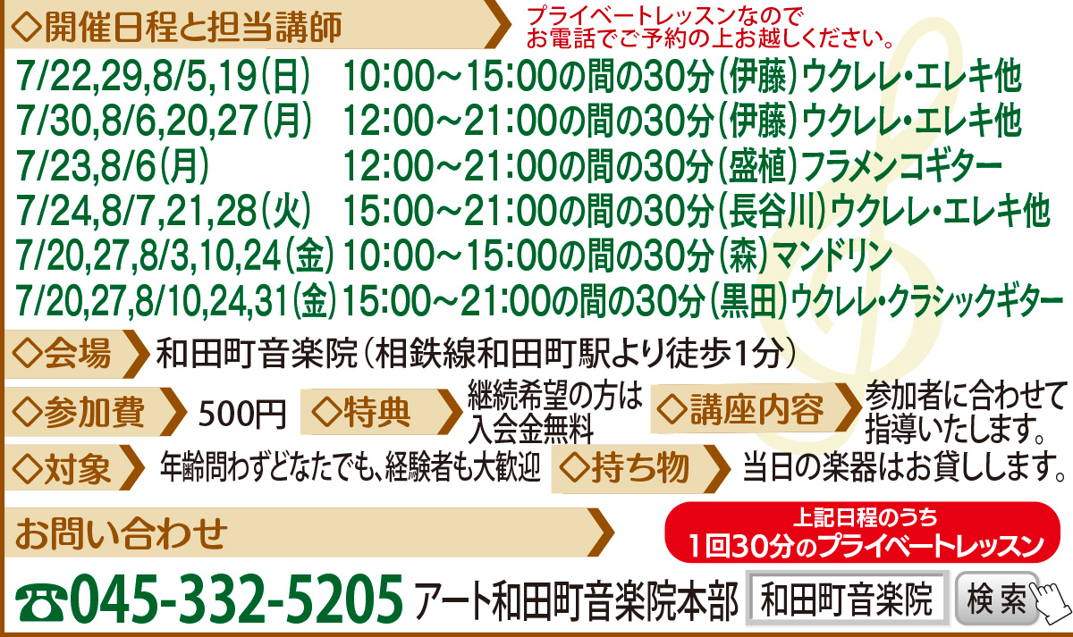 プライベートレッスンでギターやウクレレを学べる教室を和田町音楽院が主に初心者を対象に行っている。