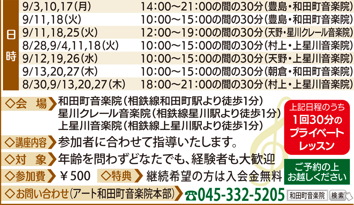 「声楽」が学べる初心者向け体験教室が「和田町音楽院」ほか2カ所で行われる。これは大人にも気軽に趣味を発見してもらおうと同院が定期開催する人気企画。