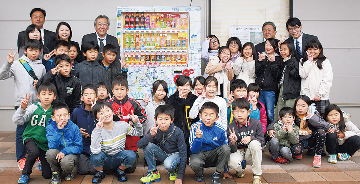 除幕式で完成した自動販売機を見た児童たちは歓声を上げて大喜び。代表の亀山結花さんと山田菜乃さんは両社に対し「絵地図が、南万騎が原の街に残ることになりうれしい」と感謝を伝えていた。同校の三浦教諭は「多くの人の協力により実現したもの。子どもたちが今後もさちが丘の街を支え、盛り上げてくれたら」と話していた。
