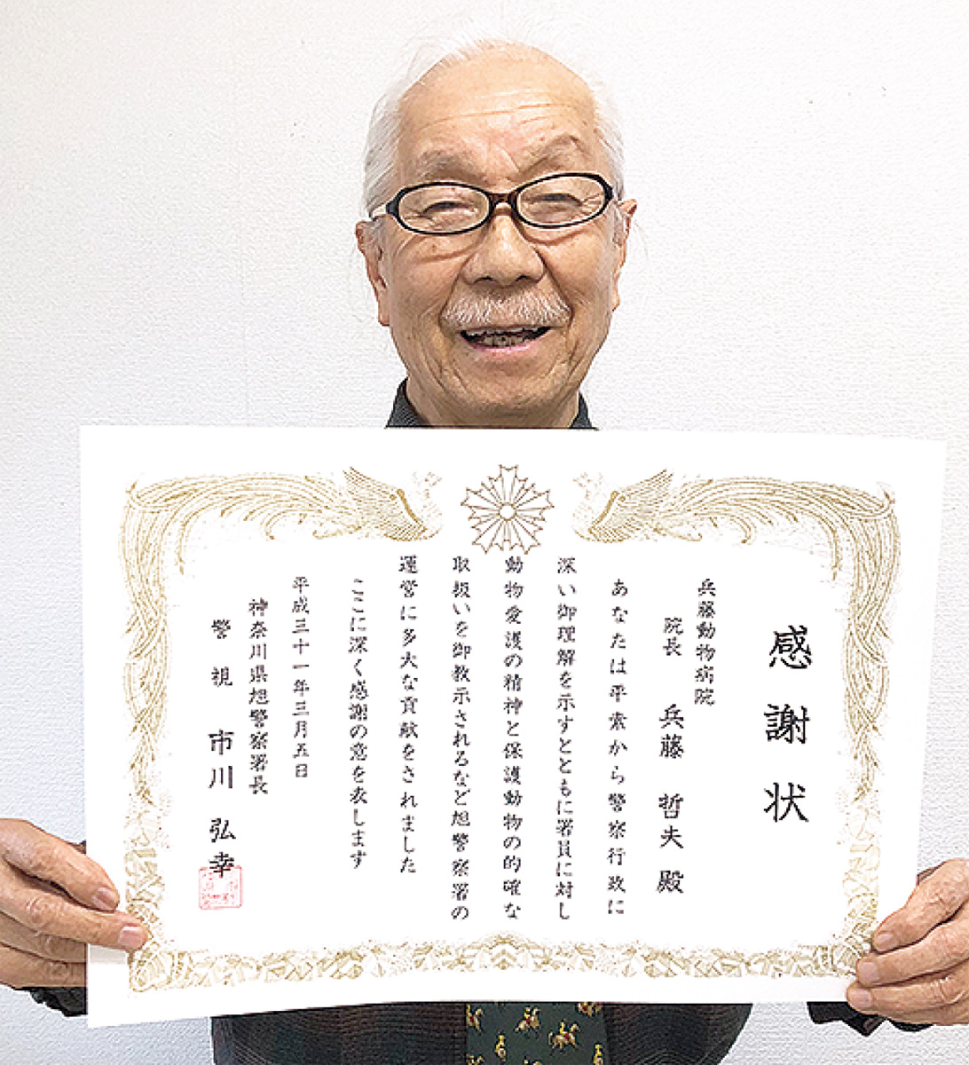 旭警察署は3月5日、迷い犬や猫などの動物保護や、署員への取り扱い指導などに多く協力したとして、市川弘幸署長から兵藤動物病院(東希望が丘)の代表・兵藤哲夫獣医師に感謝状を送った。