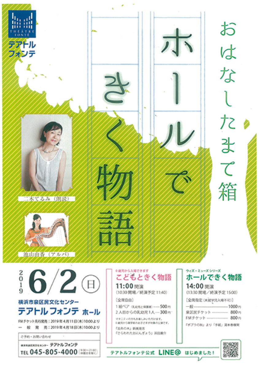 二木てるみさんと池山由香さんによる朗読コンサートが6月2日(日)、泉区民文化センターテアトルフォンテ(相鉄線いずみ中央駅直結)で開かれる。0歳児から入場できる「こどもときく物語」と一般向けの「ホールできく物語」の二部制。
