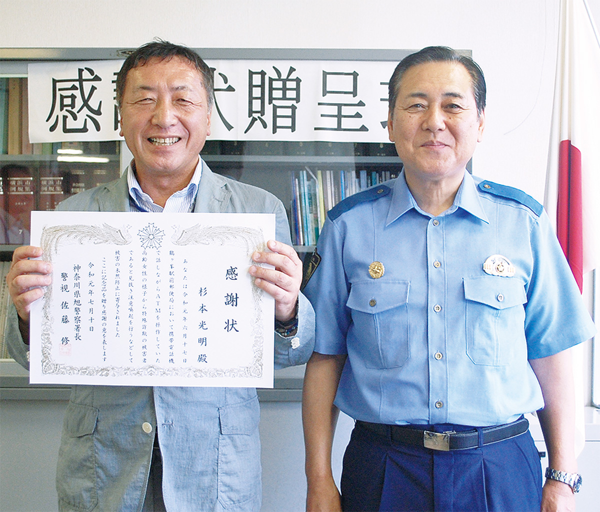 一般人の協力により、被害を未然に防いだ事案もある。同署は7月10日、振り込め詐欺の被害を未然に防いだ功績を称え、杉本光明さんに対して感謝状を贈呈した。