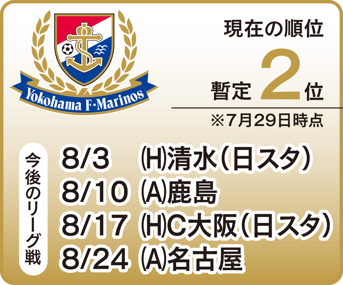 チームは7月のリーグ戦で3連勝。暫定2位と好調を維持する。エースFWエジガル・ジュニオ選手が負傷離脱する中、7月13日の浦和戦では今季リーグ初得点を決めたMF遠藤選手らの更なる活躍がカギとなりそうだ。