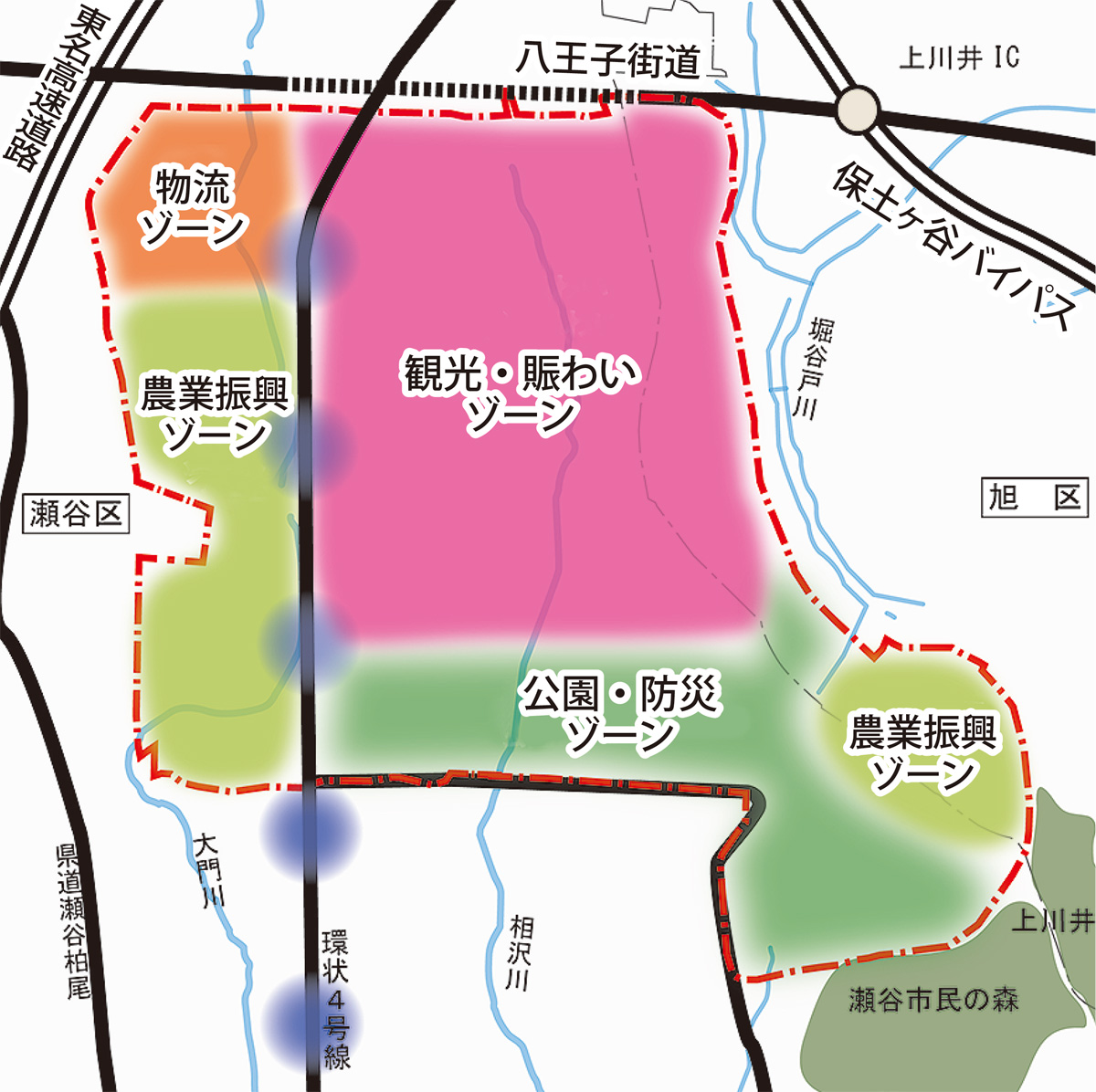 「農業振興」(約50ヘクタール)は環状4号線の西側と市民の森近くの2カ所。営農を希望する地権者を中心に都市農業を行う。南側に位置する「公園・防災」(約50ヘクタール)は花博の会場跡地として、広域的に利用される公園を整備する考え。大規模災害時における消防・警察・自衛隊などの広域応援活動拠点としての機能も有するという。「物流」(約15ヘクタール)は環状4号線と八王子街道の交差点周辺で、大型化が進む物流施設の進出を想定している。