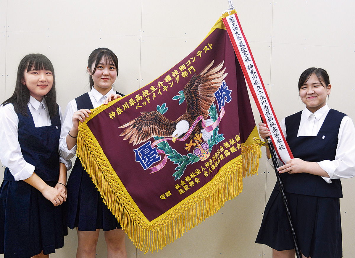 県立二俣川看護福祉高校(師岡健一校長)の福祉科2年の3人が、「神奈川県高校生介護技術コンテスト」のベッドメイキングペア部門で最優秀賞を受賞。同部門で3年連続の最優秀賞受賞を達成した。