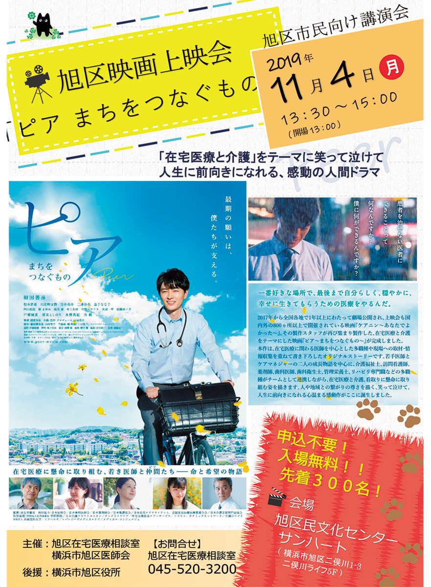 在宅医療と介護をテーマにした映画「ピア まちをつなぐもの」が11月4日(月)、旭区民文化センター・サンハート(二俣川ライフ5階)で開催される。旭区医師会・旭区在宅医療相談室主催、旭区役所後援。