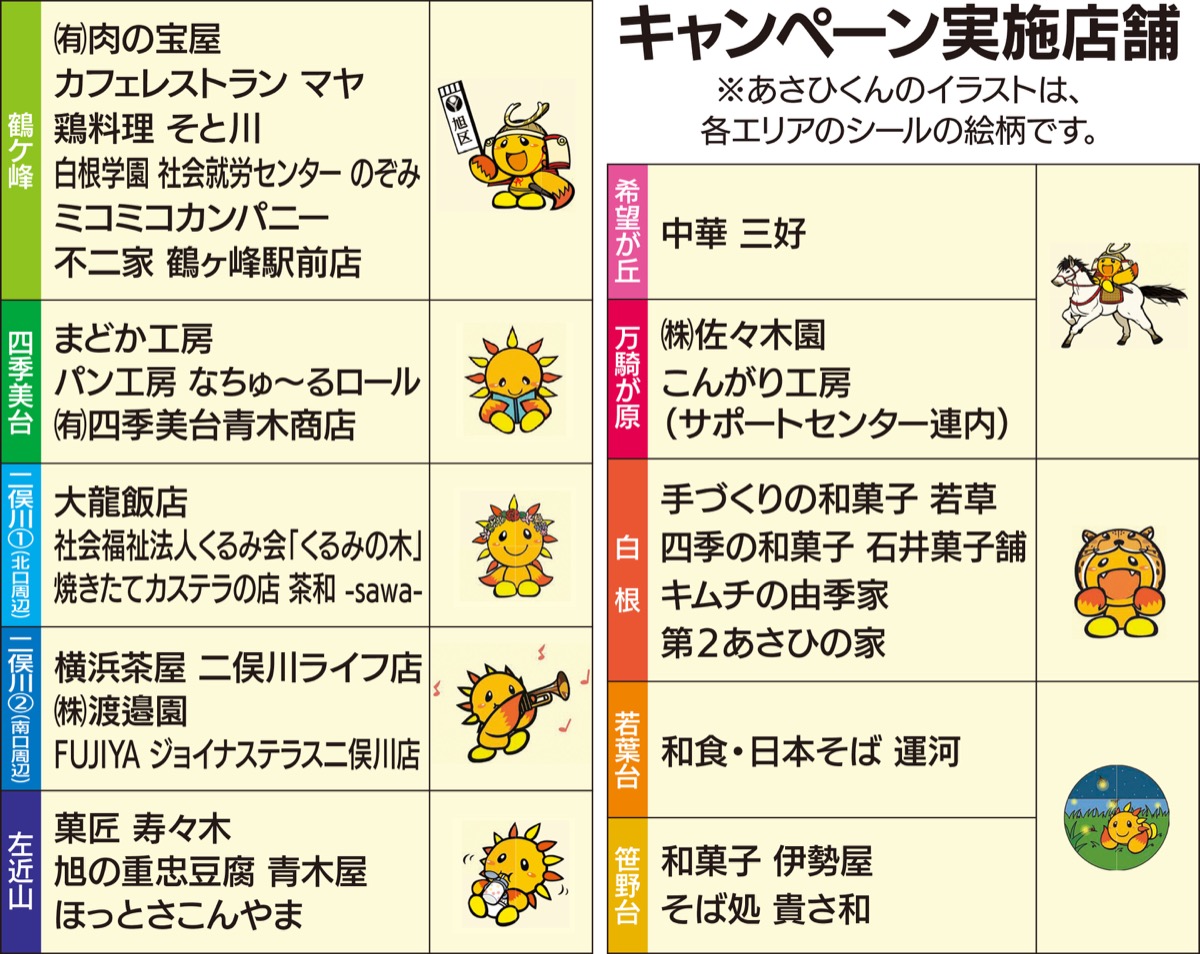 旭区役所は12月1日から、「あさひの逸品キャンペーン」を開催している。期間中、実施店舗で逸品を購入または食事をすると、エリア別の「あさひくんお名前シール」がプレゼントされる。来年1月31日(金)まで。詳細は、旭区ホームページへ。