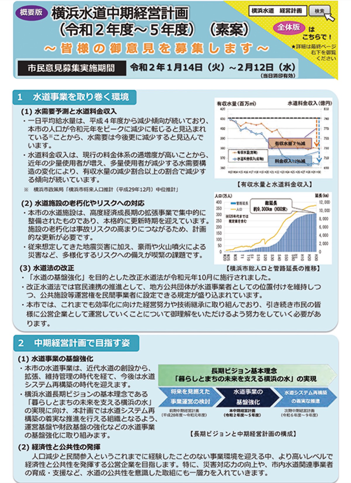 横浜市水道局は「横浜水道中期経営計画(2020年度〜23年度)」(素案)を策定し、市民意見を募集(1月14日〜2月12日の期間)しています。素案は「人口減少に伴い水道料金収入の減少傾向」や「管路・施設の保全・更新費」をあげ、「事業環境に相応しい水道料金体系に見直す」としています。